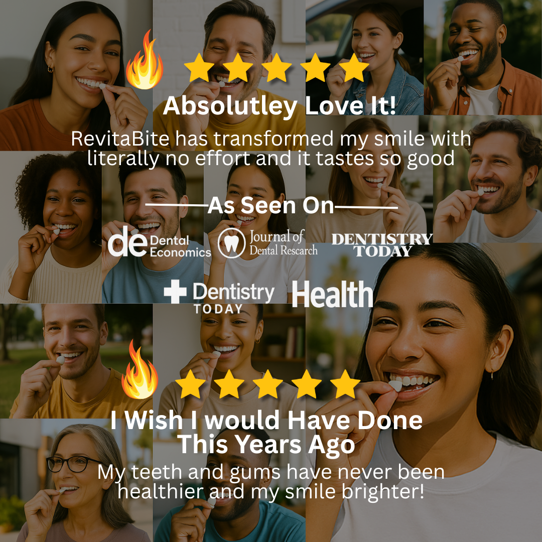 “RevitaBite made my oral care routine so easy, and my dentist noticed the difference!” – Sarah M. Join a community of users who’ve transformed their smiles with RevitaBite’s convenient, effective formula. Try it risk-free with our 30-day money-back guarantee!