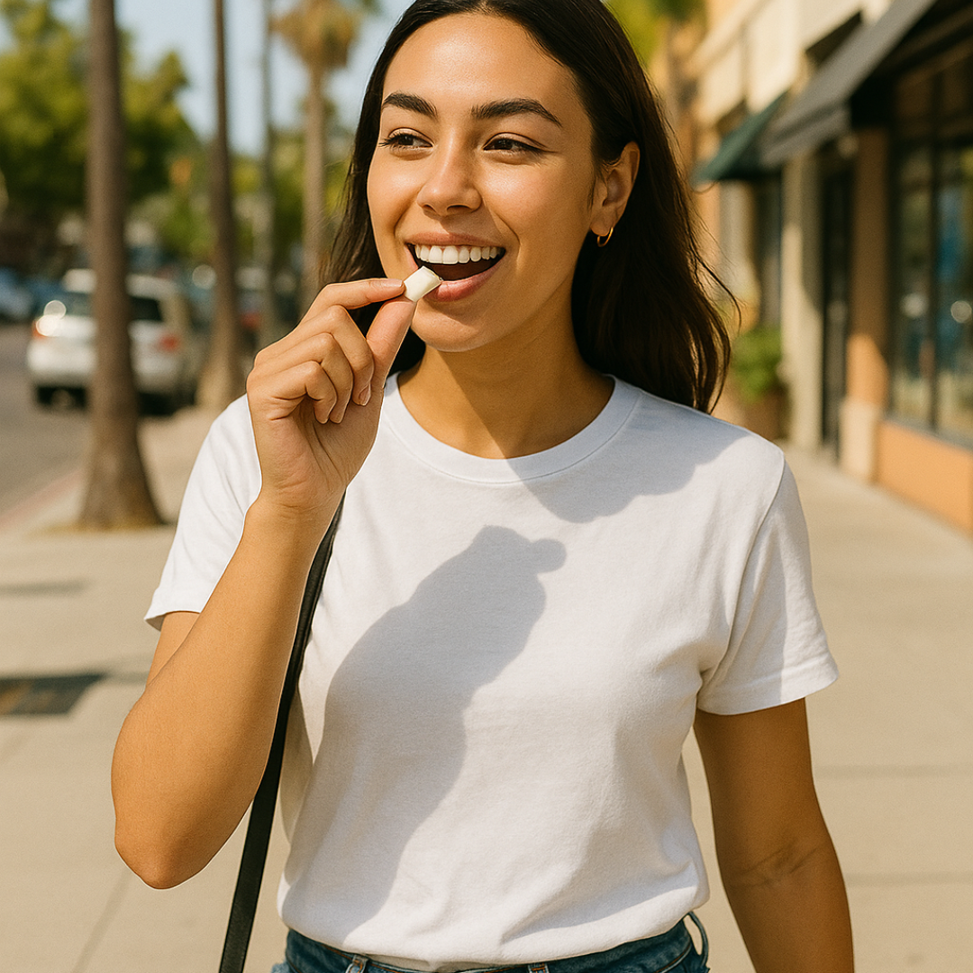 Brushing and flossing are essential, but life gets busy. RevitaBite protects your teeth and gums in just 30 seconds – pop a piece anywhere, anytime. Infused with natural ingredients like xylitol and mint, it freshens your breath and fights plaque on the go. No sink needed, just hassle-free oral care you’ll love!"